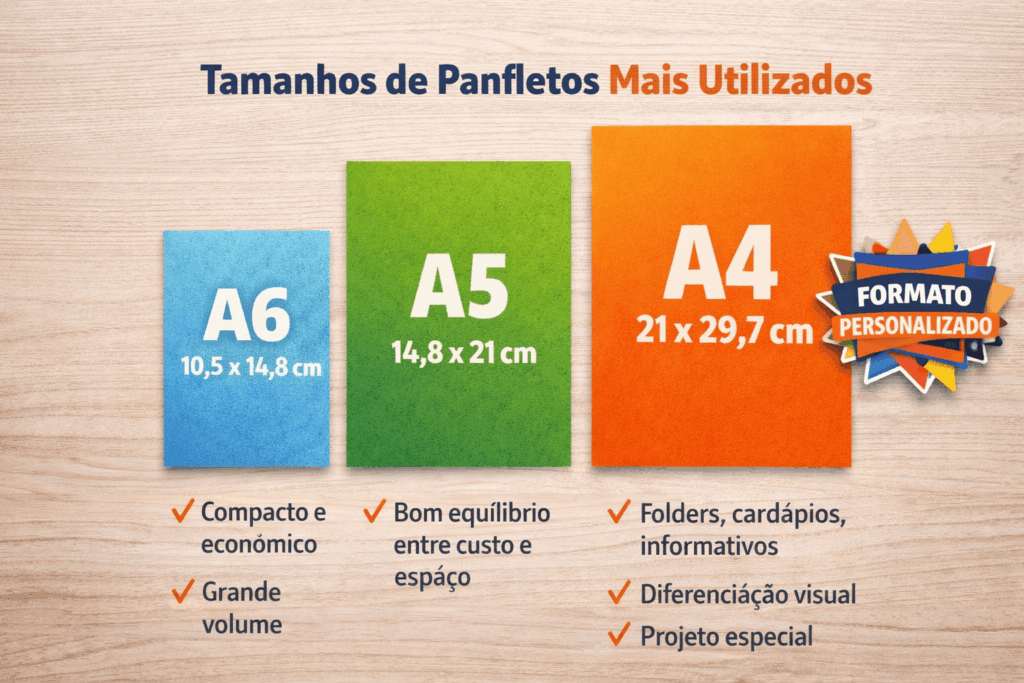 Quanto menor o formato, menor tende a ser o custo unitário. Já tamanhos maiores permitem mais informações, imagens e destaque visual.